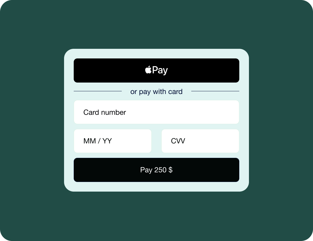 Host the payment process directly on your site without redirecting customers. You can collect card data through your own URL (e.g., pay.your_domain.com) and securely transmit it to our system for processing.